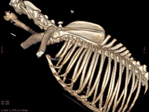 Because the technique uses a very fine beam of Xrays detected by a fine array of sensors a 3D picture can be built up of the subject being examined. There are three types of CT, helical, linear and cone beam, helical and linear provide the greatest image quality allowing detailed imaging of patients as large as a Great Dane’s chest to as small as a kitten’s foot.